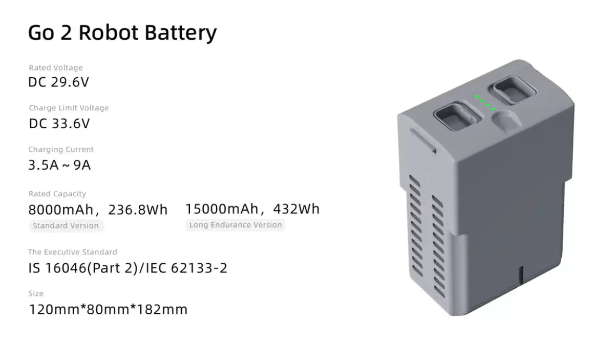 Go2 is equipped with a battery capacity increased to 8,000mAh, as a 15,000mAh ultra-long life battery is optional, and a voltage increased to 28.8V to improve motor efficiency, power and stability.